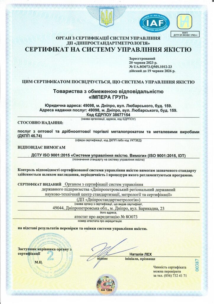 Компания сертифицирована по системе ISO 9001:2015 менеджмента контроля качества. В «Импера Групп» внедрена собственная система контроля качества поставляемой продукции, которая начинается еще на этапе закупки товара у производителя и заканчивается приемкой товара у себя на складе собственной аттестованной экспресс-лабораторией исследования металлов и сплавов.